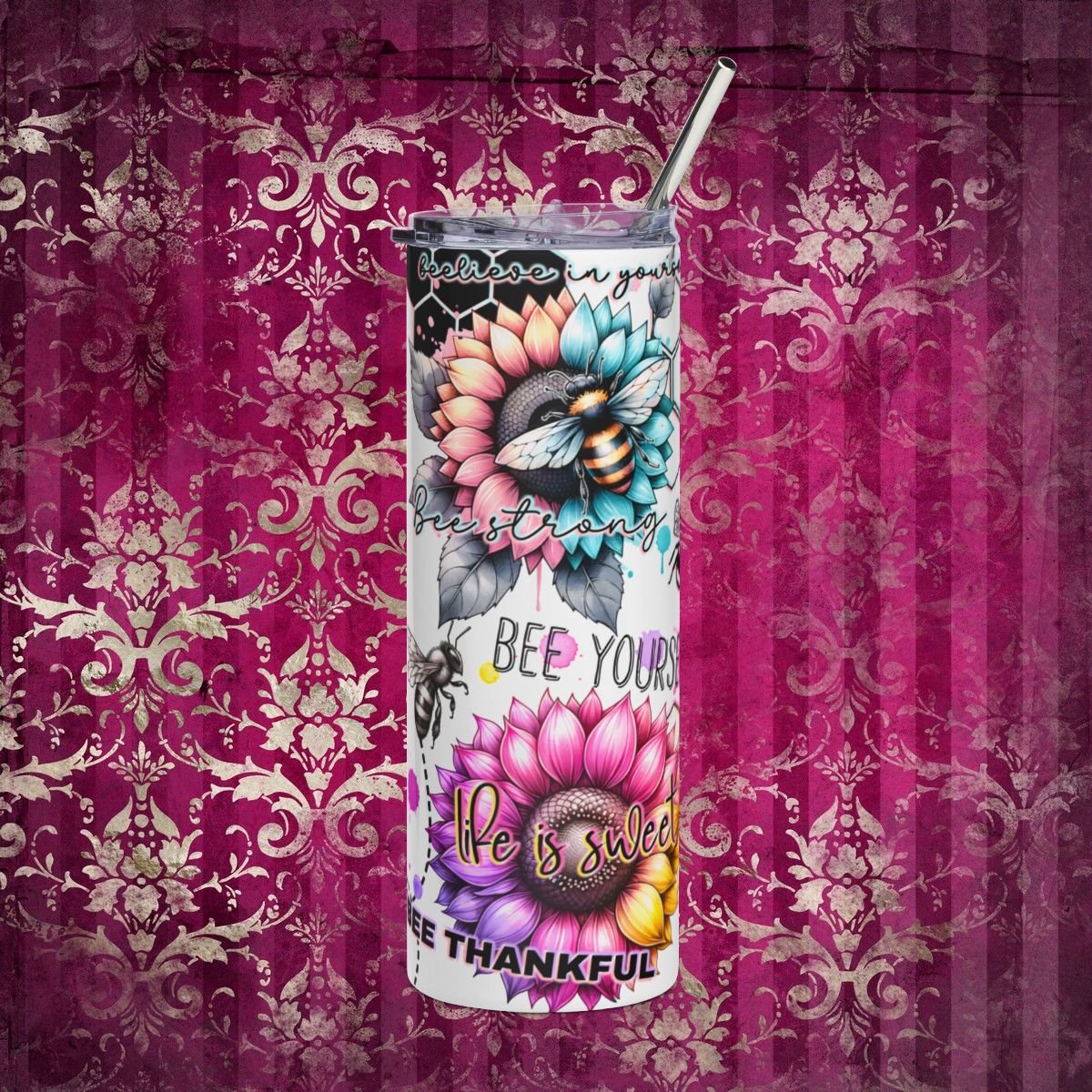Bee-lieve in yourself with this vibrant bee affirmation tumbler! Featuring adorable illustrations of bees paired with uplifting affirmations and motivational phrases that remind you to stay positive and keep buzzing. The tumbler bursts with bright, cheerful colors, sunny yellows, warm oranges, and vibrant florals, that capture the joyful, hardworking spirit of these amazing pollinators. Perfect for nature lovers, bee enthusiasts, or anyone seeking daily inspiration with a touch of whimsy. Whether you're enjoying your morning coffee or staying hydrated throughout your busy day, this colorful tumbler reminds you that you're doing amazing, sweetie! Makes a wonderful gift for anyone who needs encouragement to bee their best self!