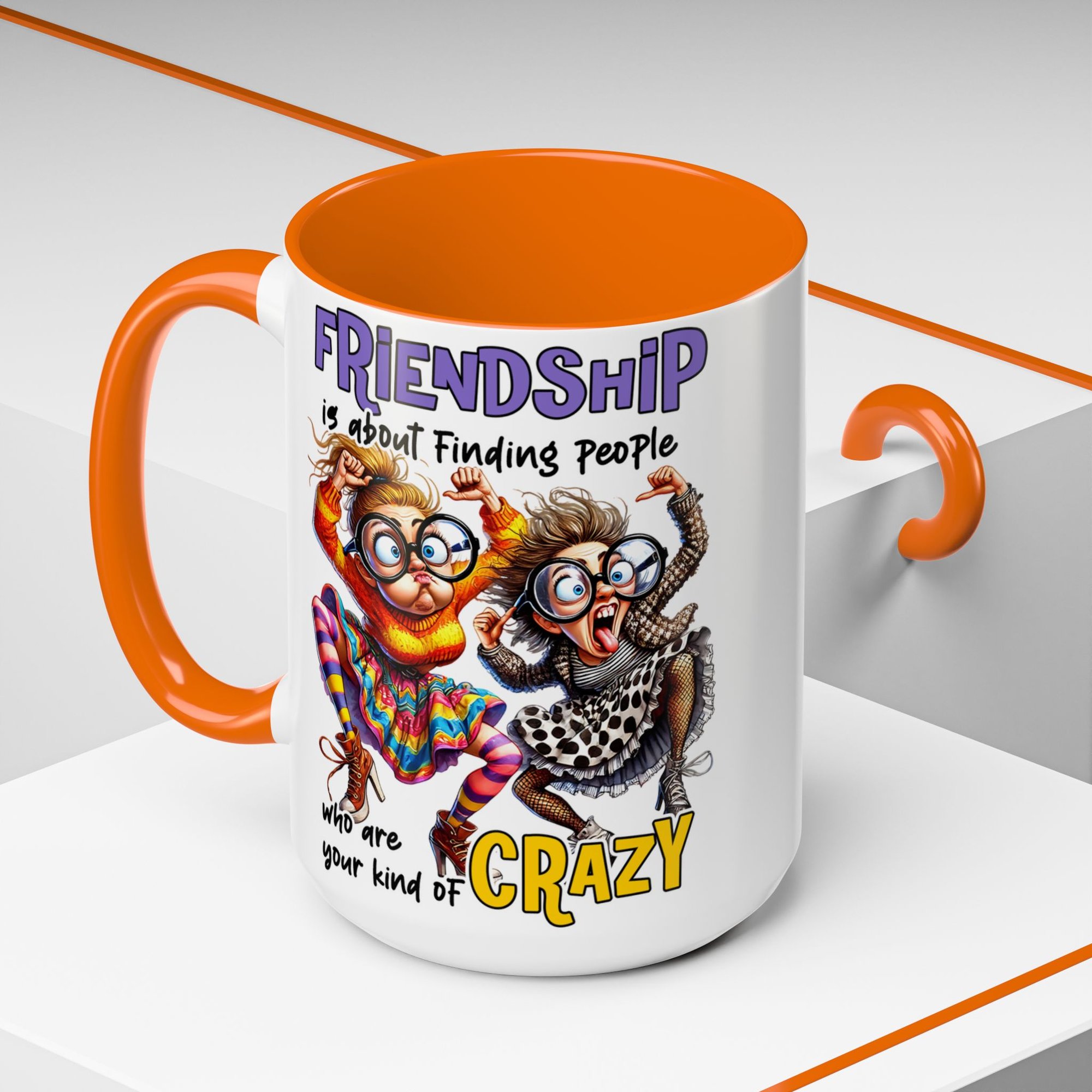 This vibrant ceramic mug brings playful energy to your morning routine. Bright, high-definition print wraps around the cup, featuring two joyful, eccentric characters and the cheerful message about finding friends who share your kind of crazy. The colored interior and handle add a pop of contrast against the glossy white exterior, making each sip feel a little more fun. Durable and practical — microwave and dishwasher safe, it’s built for everyday use and keeps its vivid colors wash after wash. Lead- and BPA-free for safe drinking.