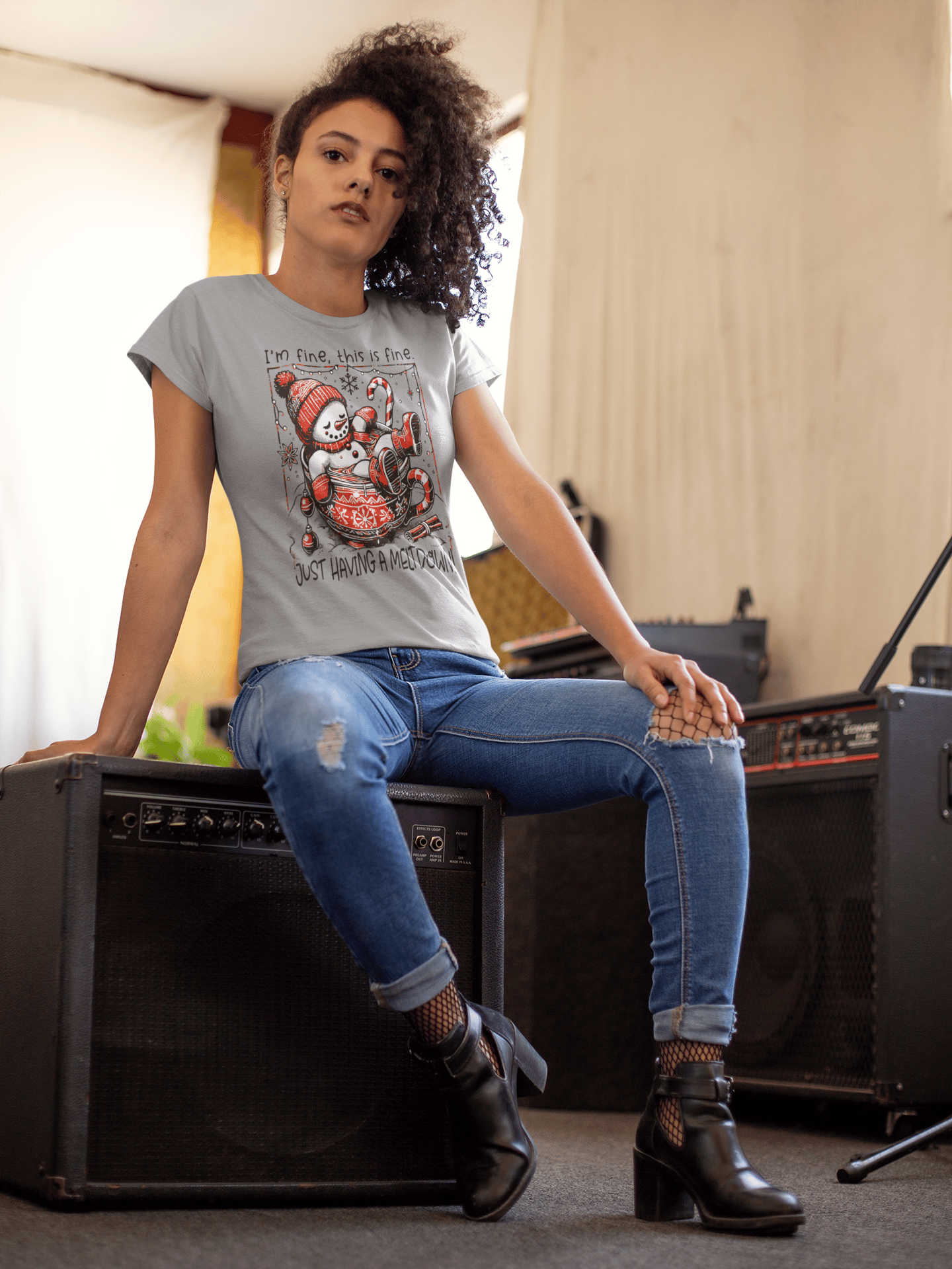 The front art shows a smiling snowman slumped into a patterned mug, candy canes and ornaments scattered around, with the hand-lettered line: “I’m fine, this is fine — just having a meltdown!” It reads like a private joke shared between friends who love low-key, irreverent holiday motifs. The shirt drapes easily for everyday layering: stand-up at a tree-lighting, sip cocoa at a market, or curl up on the couch while everyone else fusses over decorations. Subtle distressing in the illustration and a muted red-and-gray palette keep the vibe vintage and lived-in, so it pairs naturally with denim, cozy cardigans, or a favorite hoodie when the temperature drops.