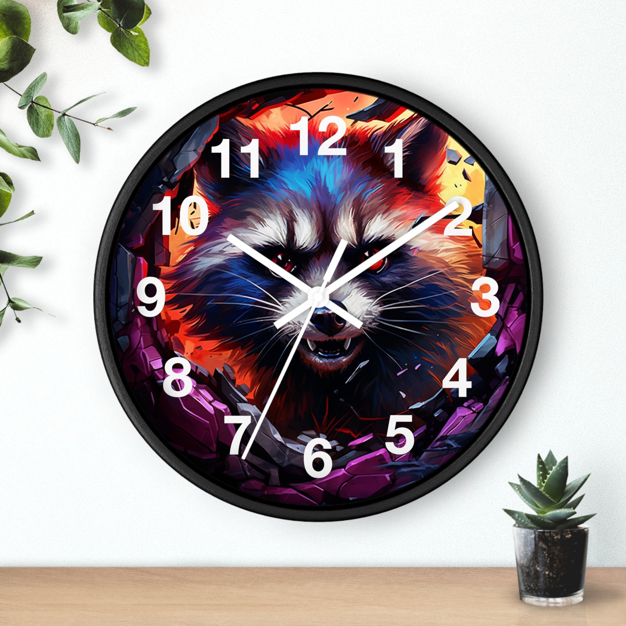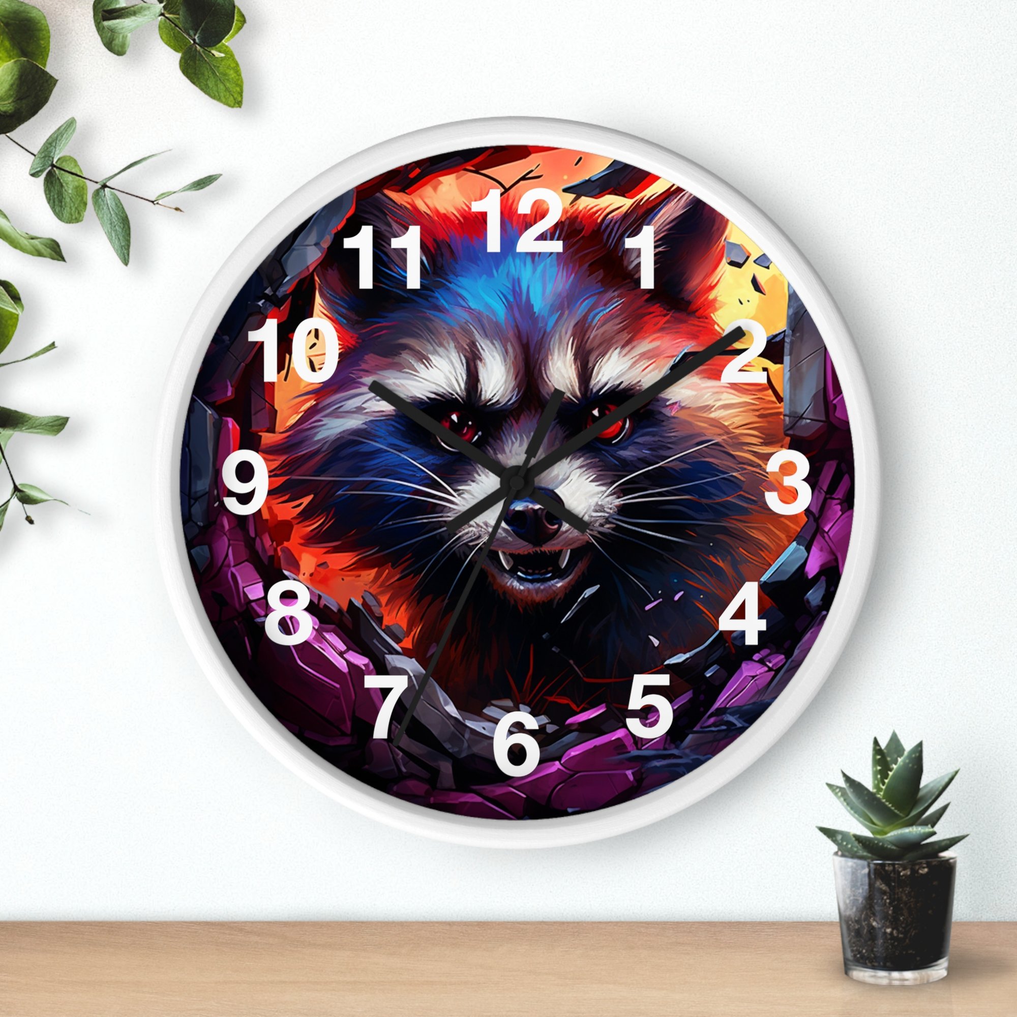 This bold wall clock brings a fierce, colorful energy to any room. Your favorite raccoon rendered in vivid, high-contrast hues bursts from the dial, framed by your choice of natural wood, black or white casing. The silent mechanism keeps time without ticking distractions, while the plexiglass face preserves sharp, vibrant printing that pops from across the room. Hang it in a studio, game room, or living space to add an edgy, artistic focal point that reflects a love of vivid illustration and attitude.