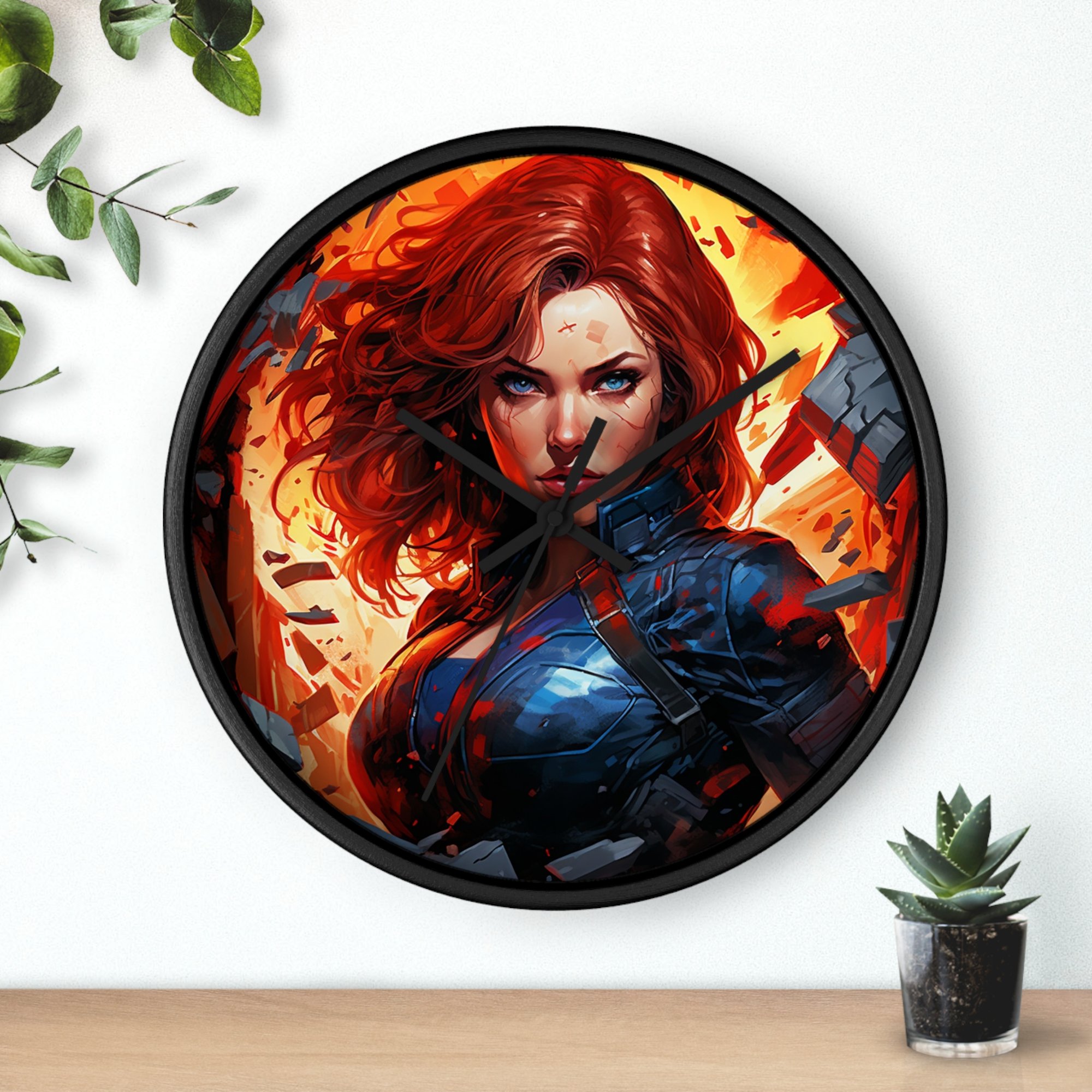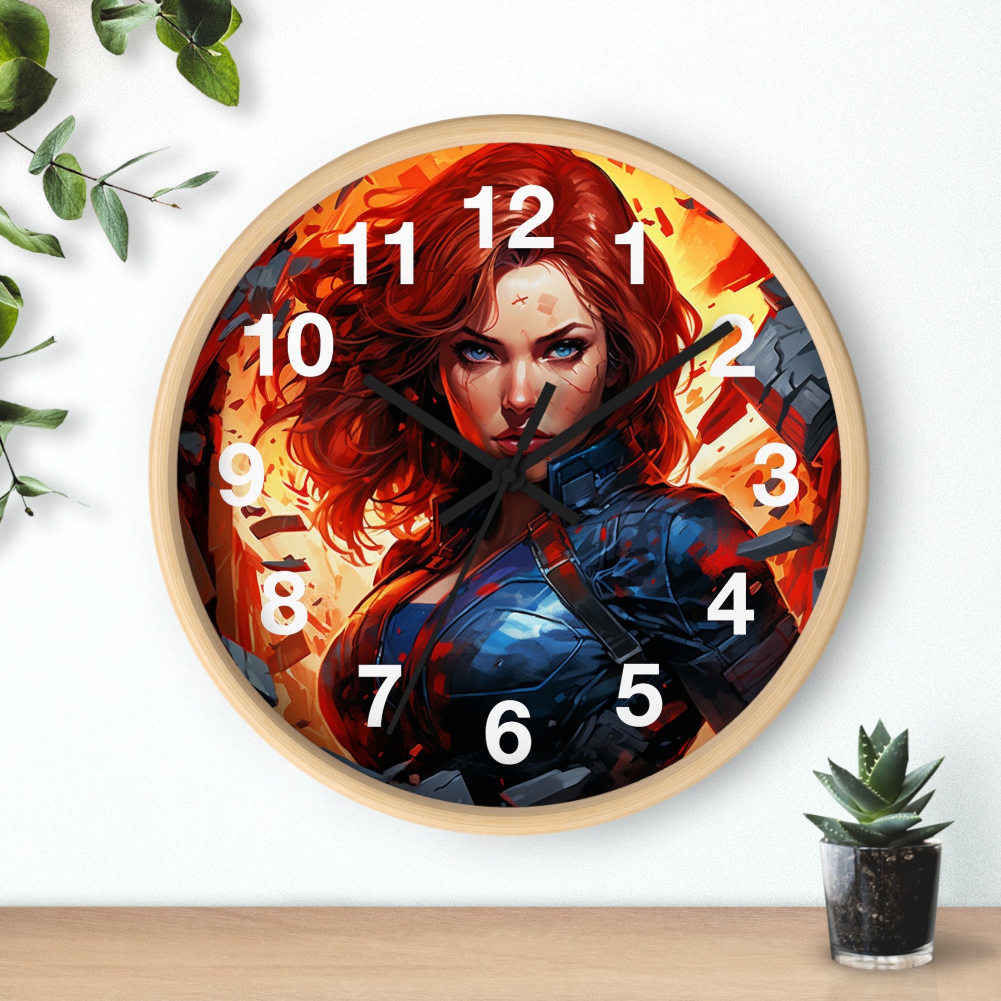 This 10" wall clock brings a bold focal point to any room with vivid, high-contrast artwork and a clean numeric dial. The wood frame and plexiglass face protect a vibrant print that captures motion and intensity, while the silent metal mechanism keeps ticking unobtrusive. Hang it in a studio, living room, or gaming nook to anchor the space with color and character. The pre-installed hook and single-AA operation make it simple to install and keep running.