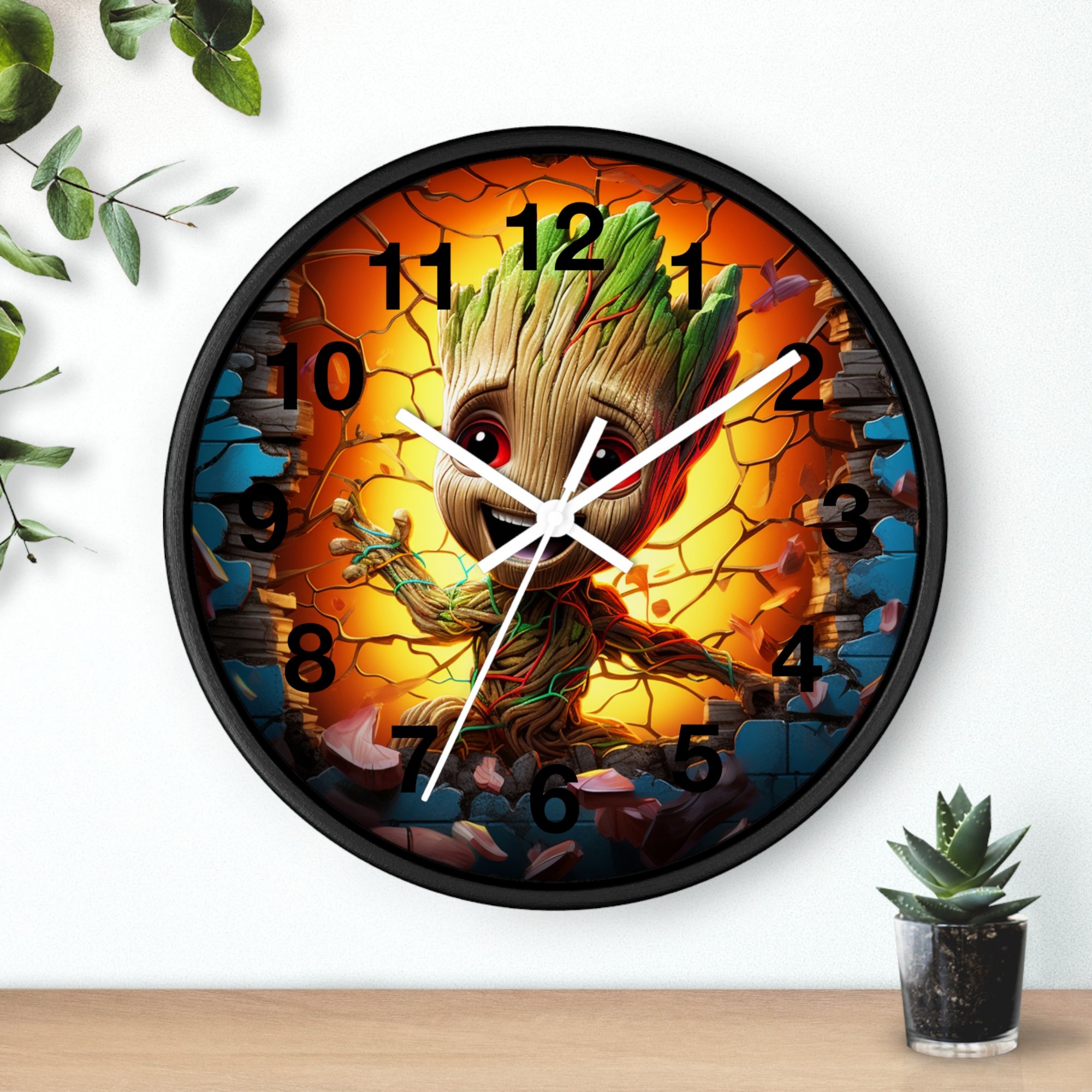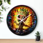 A playful, artful wall clock that brings joyful energy to any room. The vibrant, high-resolution print leaps off the gleaming plexiglass face, framed by your choice of natural wood, black, or white. At 10" round it fits neatly on a bedroom, playroom, or studio wall, and the silent mechanism keeps time without ticking distractions. Lightweight and ready to hang with a pre-installed hook, this clock combines kidlike wonder with practical design, a bright accent that keeps the day moving with a smile.