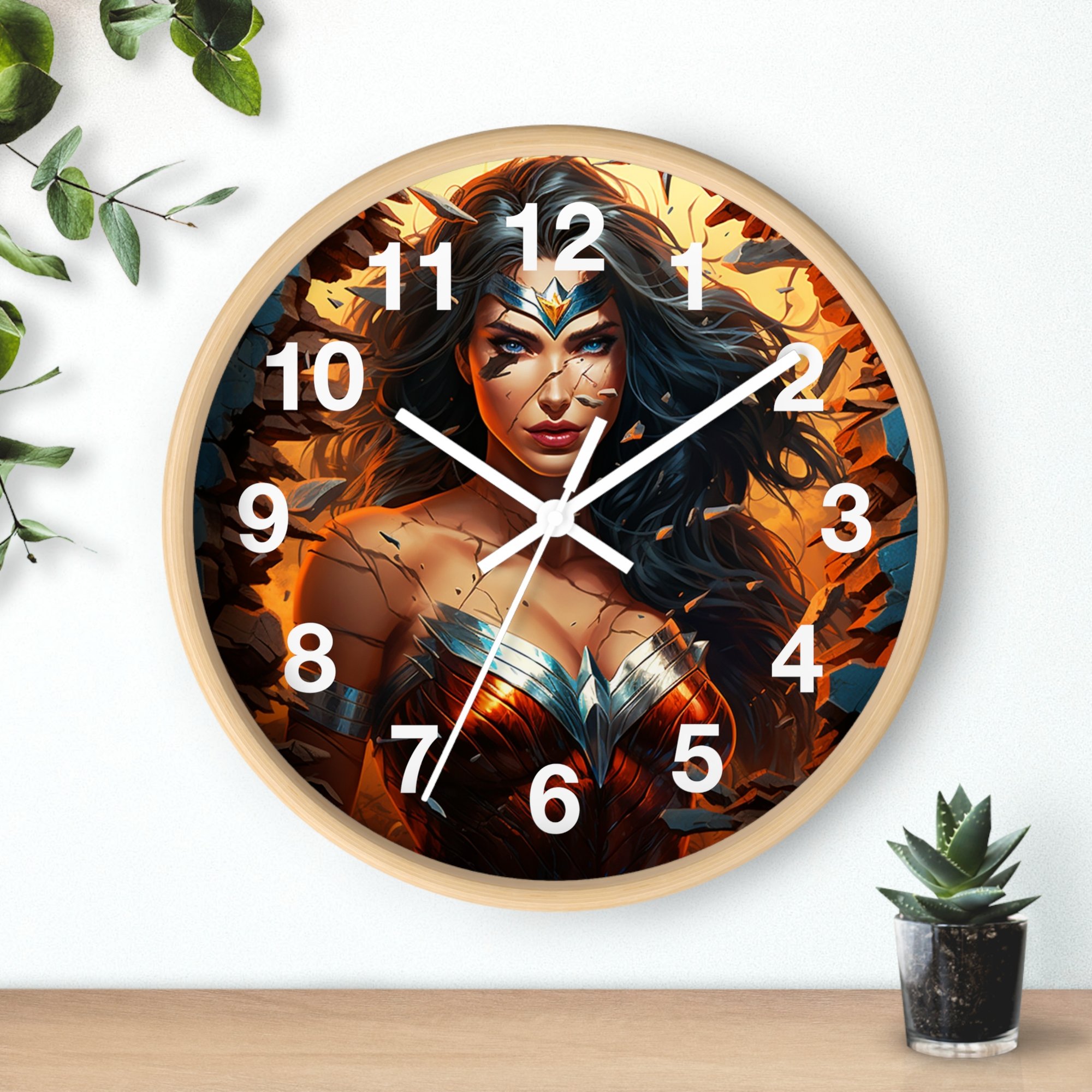 A striking 10" wall clock that brings bold, heroic energy to any indoor space. The printed plexiglass face showcases a powerful, dynamic illustration of a warrior figure rendered in rich, warm tones, a centerpiece that reads like art and tells time at once. Lightweight wood framing and a whisper-quiet metal movement keep the focus on the image while the pre-installed hook makes hanging effortless. Choose natural, black, or white frame and hand color options to match your room’s vibe. Runs on one AA battery and keeps time silently so your walls stay both dramatic and serene.